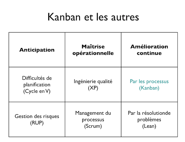 Kanban vient en complément d’une méthode de gestion de projet et d’un processus.(…) Il cherche à concevoir un processus spécifique qui lui est propre et à le faire évoluer dans et avec son contexte.