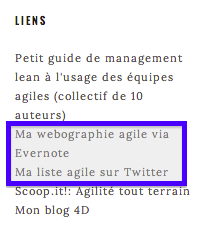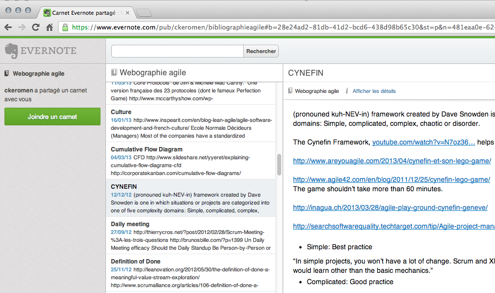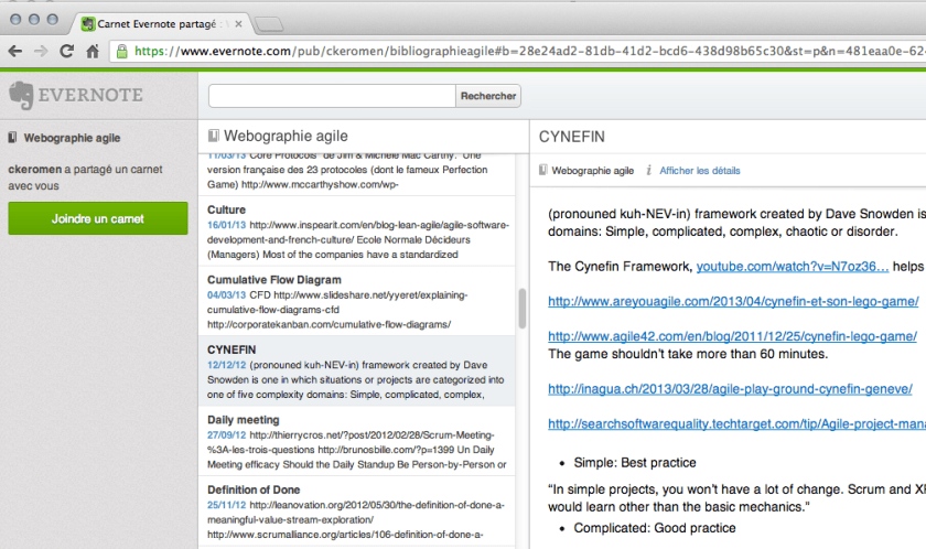 - Lorsque je butine sur le web, souvent en partant d’un tweet sur la liste précédente, je collecte les liens qui me paraissent dignes d’intérêt en les classant dans un carnet de notes Evernote. Ce carnet « Webographie agile » est également public :