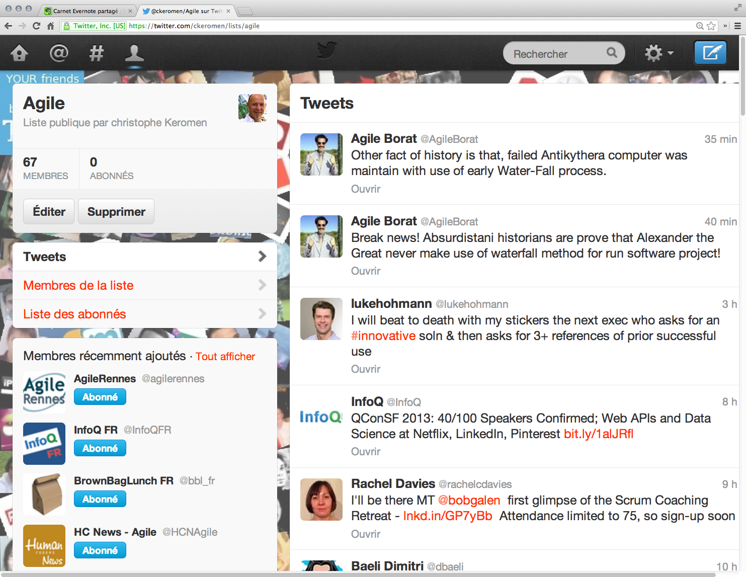 - Sur Twitter, je maintiens une liste de sources d’investigation. Je limite sciemment cette liste en évitant les profils par ailleurs référence, mais avec un ratio signal/bruit faible (pollué par beaucoup de tweets personnels par exemple). Cette liste « Agile » est publique :