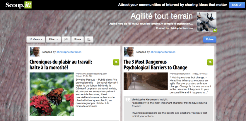 J’ai ouvert un espace de curation de contenu sur Scoop.it! pour conserver trace de ce que je voyais passer et pouvoir le mettre plus facilement à disposition des curieux. Vous trouverez ainsi sur Agilité tout terrain, tout ce qui me parait se rapporter de près ou de loin à l’agilité hors contexte spécifiquement IT.
