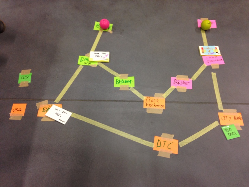 Virginia Anderson nous décrit un modèle métier assez complexe, en l’occurrence le système de transactions nécessaires pour acquérir un lot d’actions. Ça paraît très simple au départ, mais le fait que les devises et les actions doivent demeurer dans le pays où se déroule la transaction complexifie très vite le déroulé.