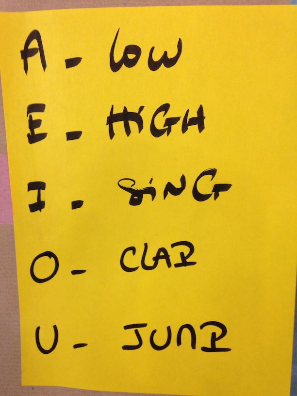 Il s’agit de dire son prénom avec une consigne en fonction de la première voyelle rencontrée dans le mot.