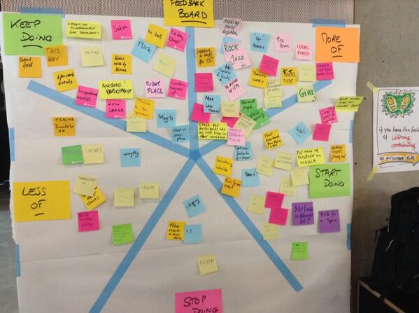 J’ai juste le temps de contempler le remplissage du tableau de rétrospective présenté sous forme d’un Starfish Feedback Board :