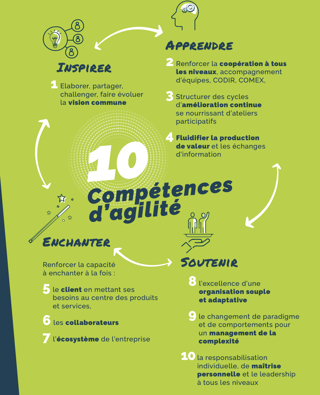 Cet article fait partie d’une série de communication sur l’agilité d’entreprise : elle-ci se structure autour de 4 processus et 10 compétences-clés.