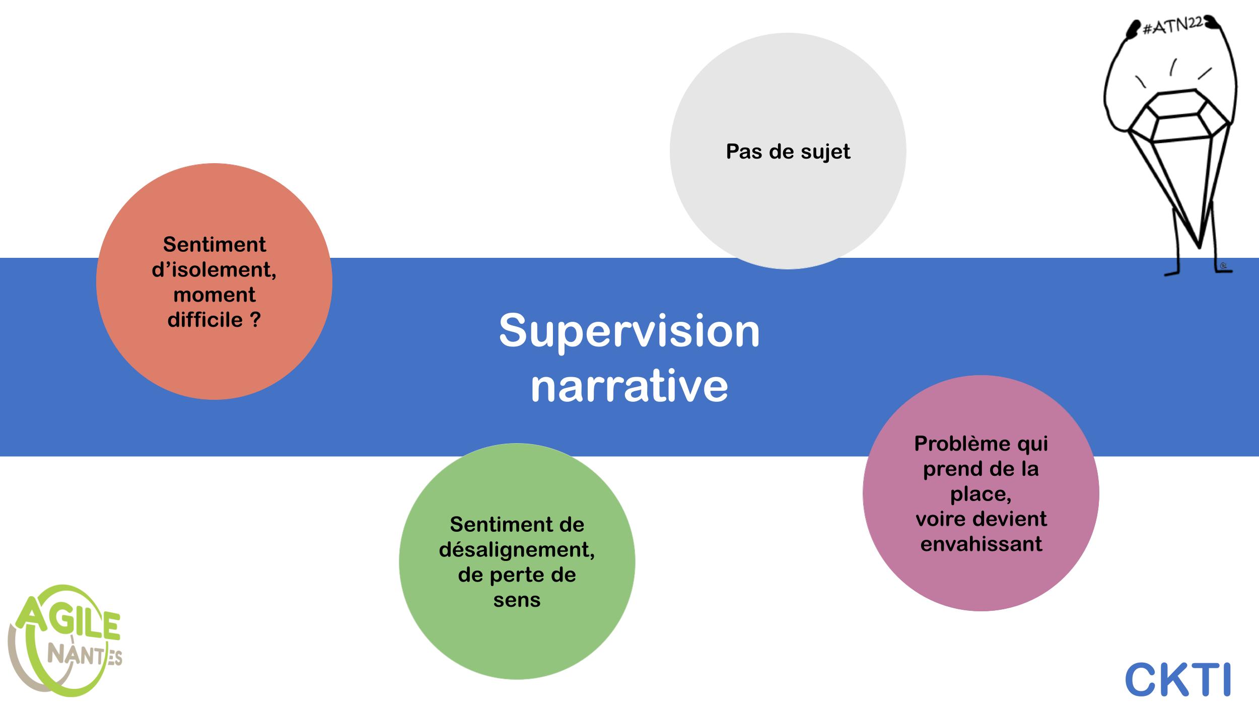 A noter que je peux recourir également à une approche narrative dans le cas où une personne arrive à la séance de supervision sans sujet. Nous travaillons alors à renforcer son alignement, la connexion à ses ressources et à une clarification de son identité professionnelle…