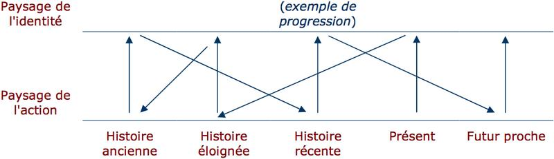 1) séquence d’inclusion en binôme utilisant une carte de questions permettant de passer du paysage de l’action (expérience d’une situation) au paysage de l’identité en passant par les valeurs, ce qui est précieux pour la personne.