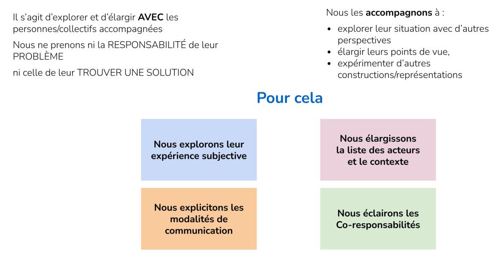 Il s’agit de prendre en compte sa propre part dans le « processus-problème » et d’examiner les actions que l’on pourrait mettre en place pour changer la situation. Cela implique de reconnaître sa responsabilité tout en cherchant à créer un espace pour des changements progressifs.