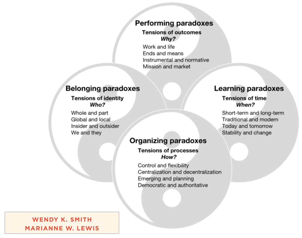 Selon Smith et Lewis (voir référence en fin d’article), les paradoxes organisationnels se classent en 4 grandes catégories :